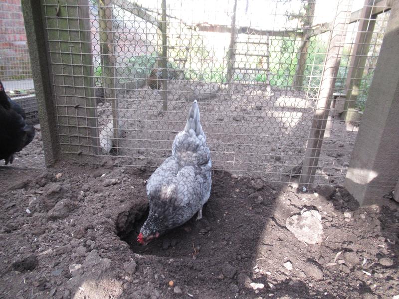 At midday I cleaned up the run and filled in her holes. After lunch when I checked on the girls Smoke was digging her hole back again.