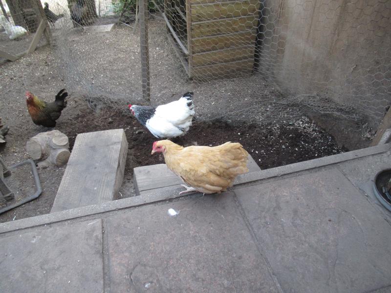 Saffron very quickly found the food, water and the afternoon treat of apple. Despite some chasing away she just bounced back and soon seemed really settled. Diamond seemed much slower to find everything. I steered her towards the patio and she did peck the apple but didn’t go to the food or water despite Saffron being there. I am sure she will soon find it when she is ready.