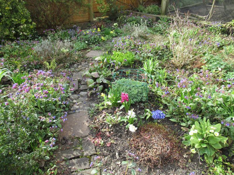 At the time I was photographing the spring bulbs but you can see the sedum next to them with the plant support in place ready for it to grow up through it.