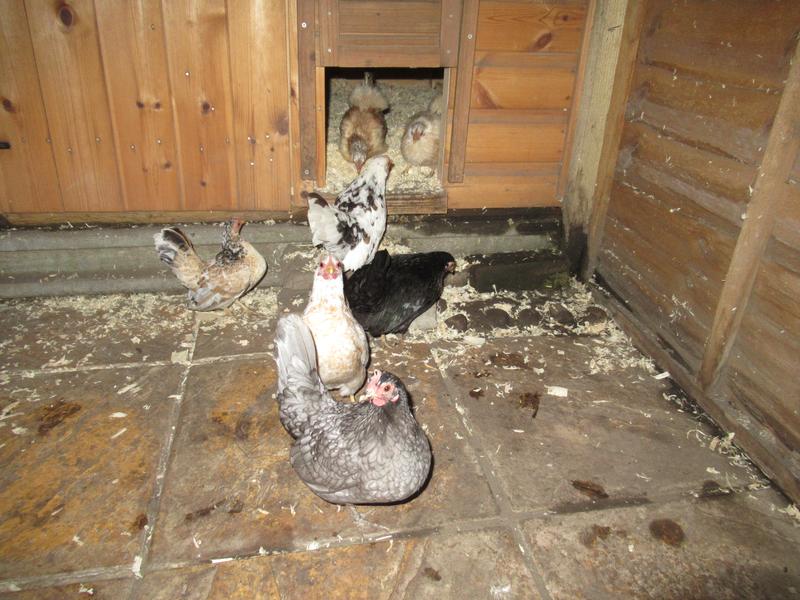 Ginger and Bonny, my two youngsters, are subjected to the same treatment at the pop-hole on hen house number 3, where they prefer to be. Tubby, one of my silkies, waits just through the hole and every time they try to go in, until she gets onto a perch, they are sent packing! Bonny has taken to going into hen house 2, a shed just like your own, where I prop the door open and have a piece of wood about 4 inches deep across the front of the door, which prevents the shavings being dispelled all over! It seems that the wider entrance eradicates the problems of the narrow gap with the pop hole.