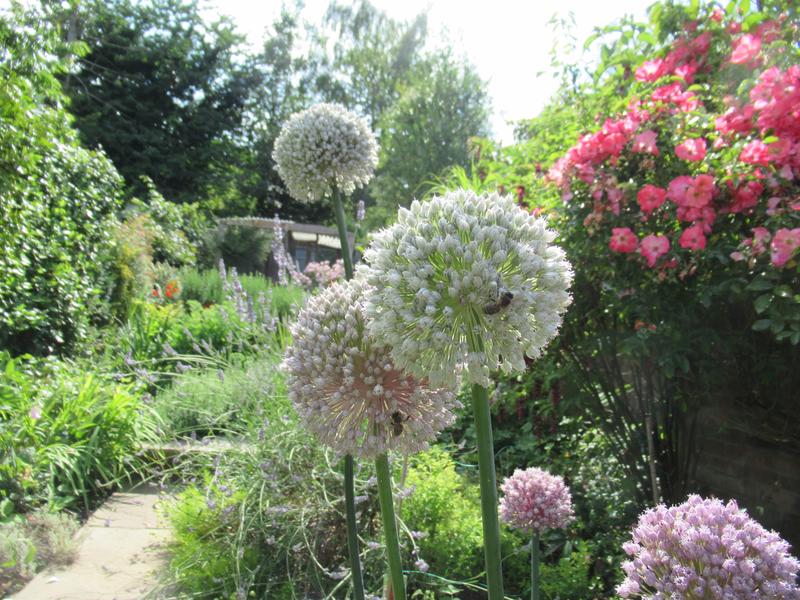 Not only have the leek flowers turned out to be spectacular after all but the bees love them. When I sit in the garden I see masses of honey bees all over the leek flowers. There is a constant busyness and some flower heads have six bees on at a time.