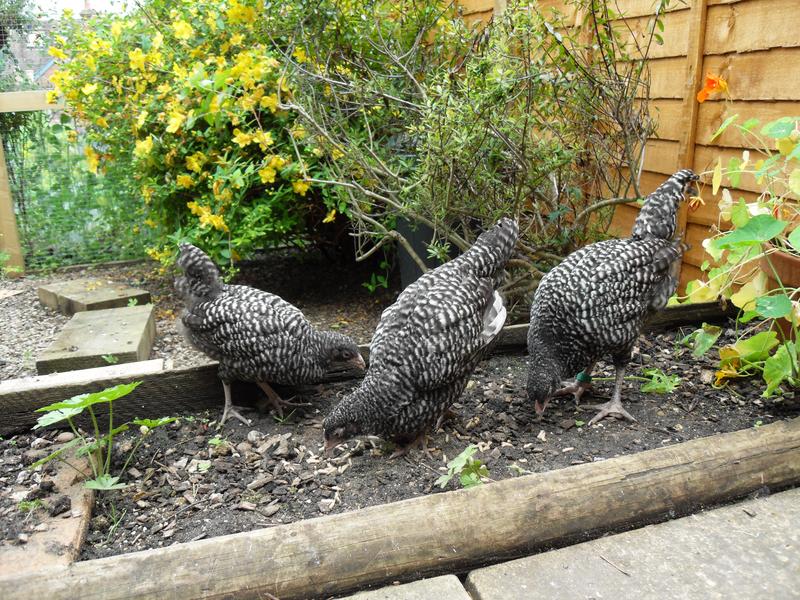 Now that we have felt Pepper’s crop, I am feeling happier about her. My other worry was that Poppy may be a rooster. Flock Mistress, very kindly e-mailed me some photos of her flock at the same age as mine. Her Cuckoo Maran (coincidentally also named Poppy) turned out to be a roo, but at this stage was twice the size of the rest of the flock. She has told me not panic yet, as they can develop at different stages. She doesn’t think my Poppy looks likes a roo. Poppy is quite different from the other two but maybe she is just a different hen. She said to try to get a photo of them side by side, which I managed today while they were eating their afternoon maggots.