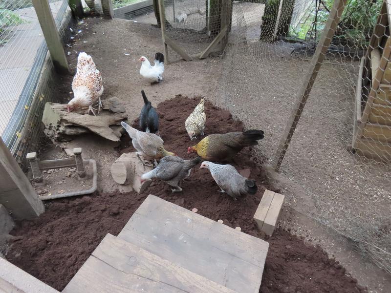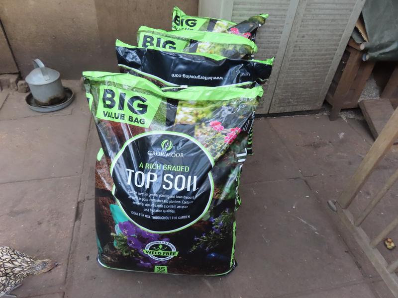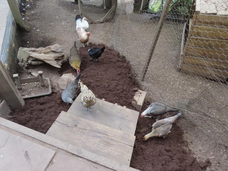 I tipped in the four bags of top soil. The girls love having fresh soil to scratch in. I leave it for them to gradually spread the soil.