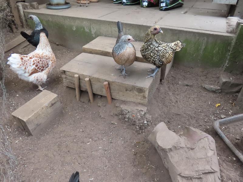 Whenever I dig over the run I spade up the soil towards the steps but it gradually gets scratched away again. The block and the log are there to stop the soil being scratched away from the patio.