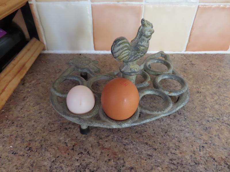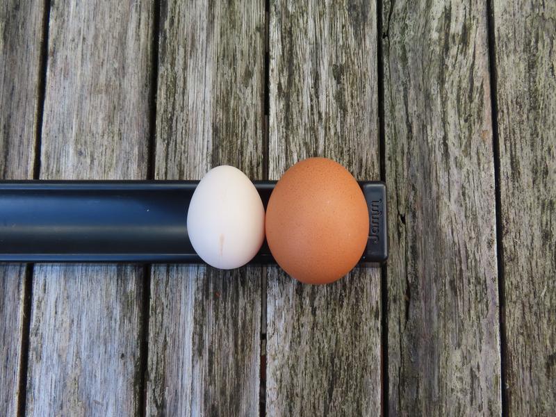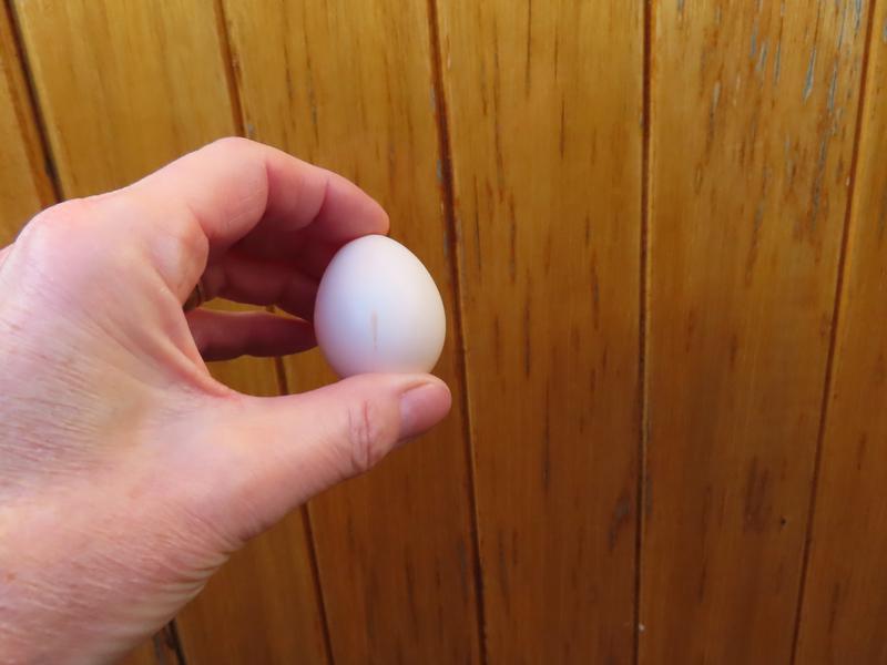 However when I checked the nest boxes at lunch time there was Silver’s first egg with the little blood streak that first eggs often have.
