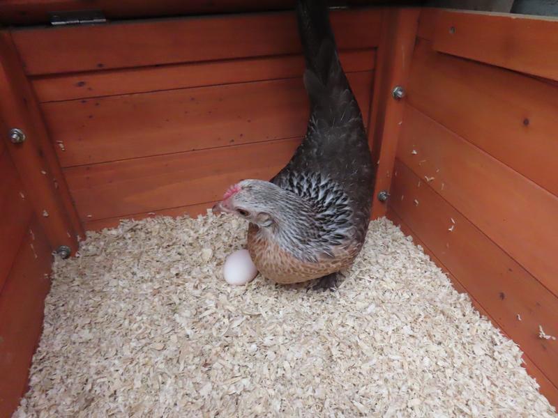 I decided to give her a bit of time to settle in the nest box and then try to get another photo. When I returned Silver had already laid her egg and was standing beside it. She laid her egg very quickly.
