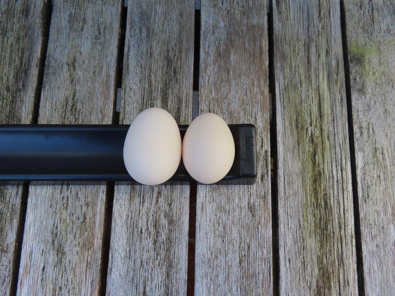 When I checked her egg was in the nest box nearest the chicken shed. It is bigger than Silver’s and Ginger’s eggs. I remember now that her eggs have always been quite big for her small size.