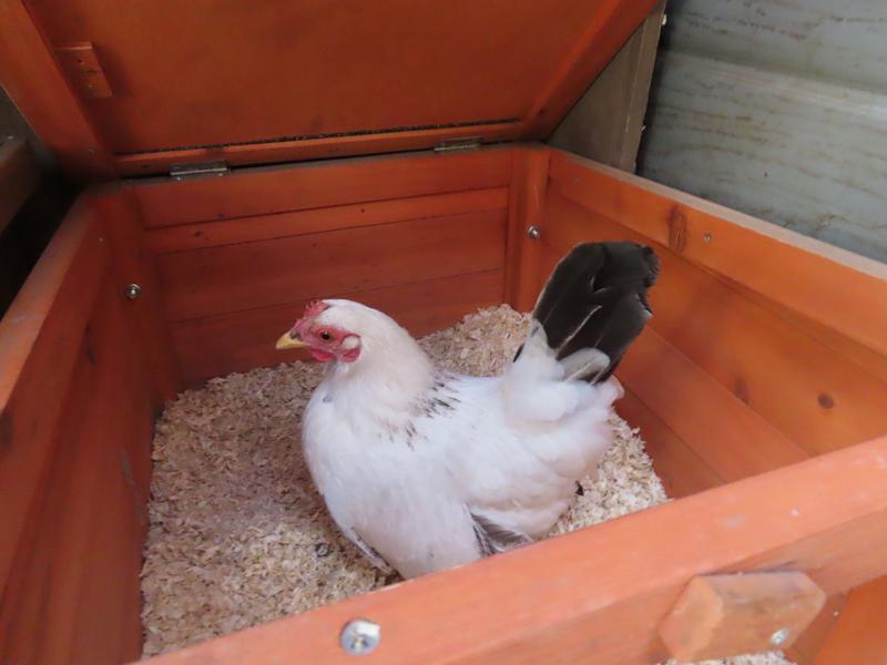 As usual it is a case of one in and one out. On the same day as Snow laid her egg, Gold went broody. She had laid eight eggs in fourteen days. Usually the girls start laying in March and yet this year we are on our second broody already. Gold had been in the nest box all day. She finally laid and there was a little pile of grey breast feathers next to her egg. When I lifted her from the nest box she was angry and shouting as loud as I have ever heard a chicken shout.