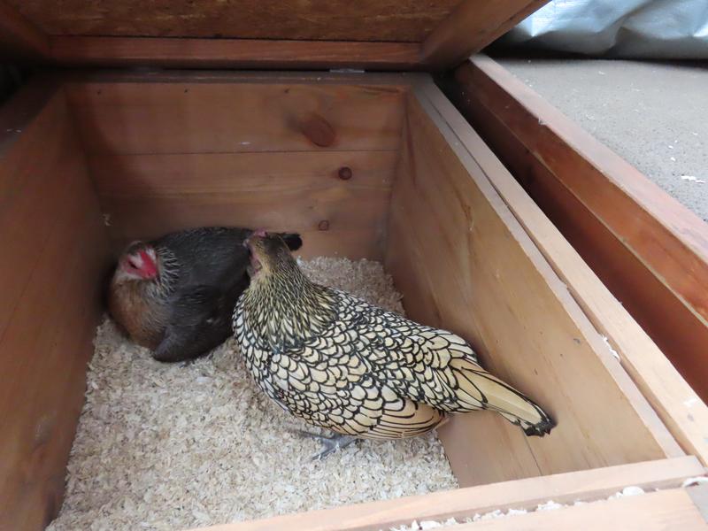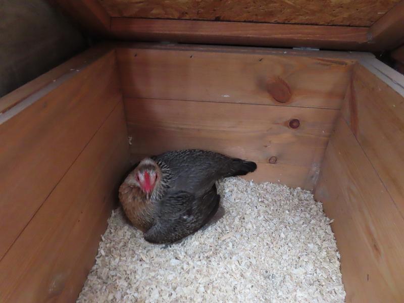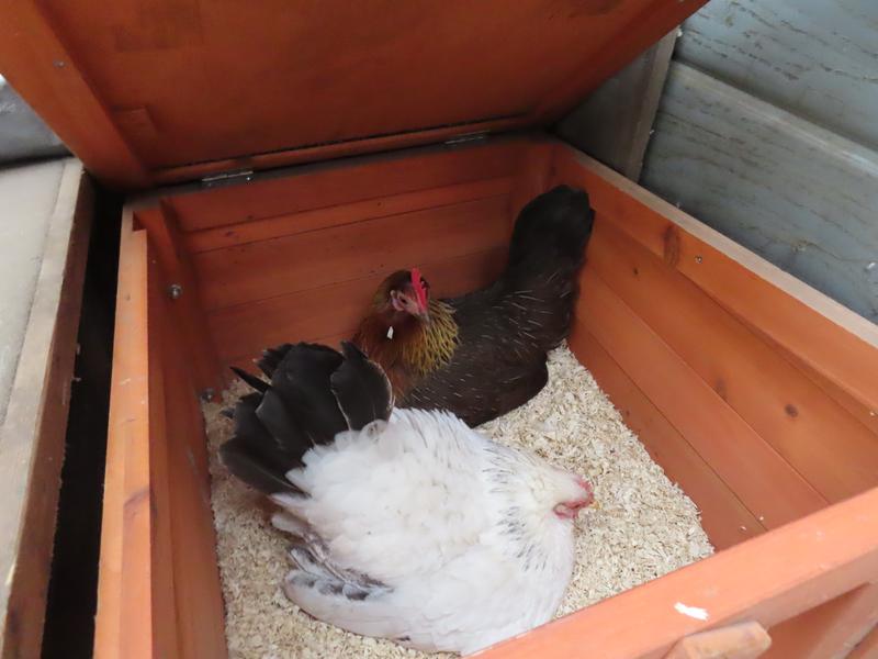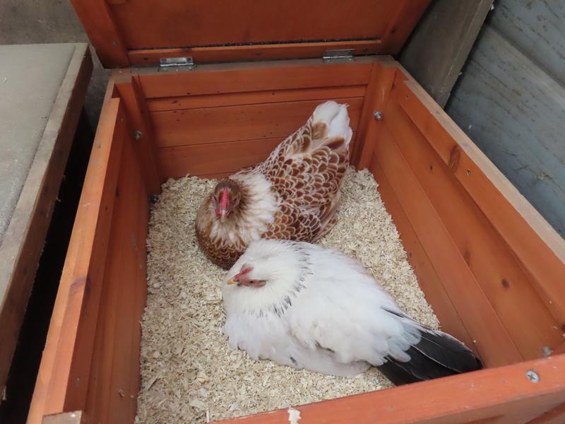 Red is next to share the nest box with broody Snow