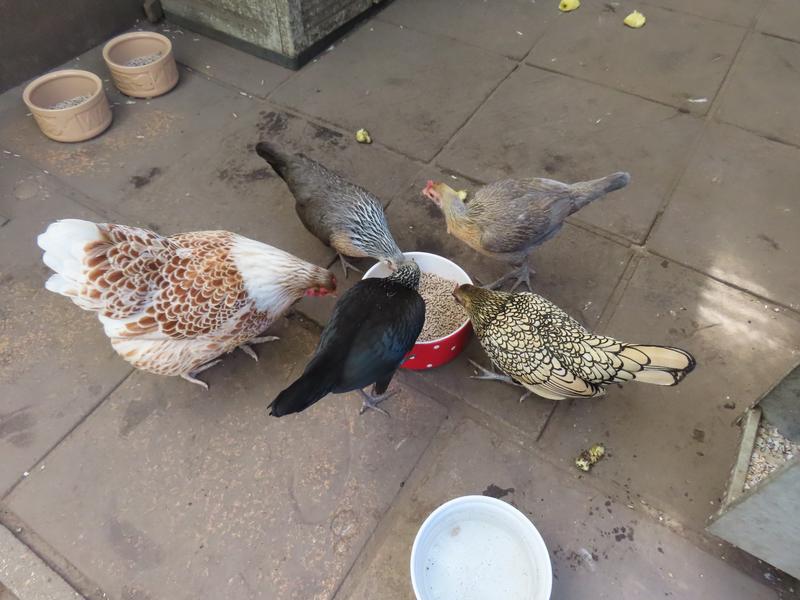 While the girls were mixed I moved the new girls’ dishes to the chickens’ patio area otherwise I knew pellets would get flicked out into the dirt and dirt would get scratched into the water. The main flock saw these new dishes as far superior to their own of course.
