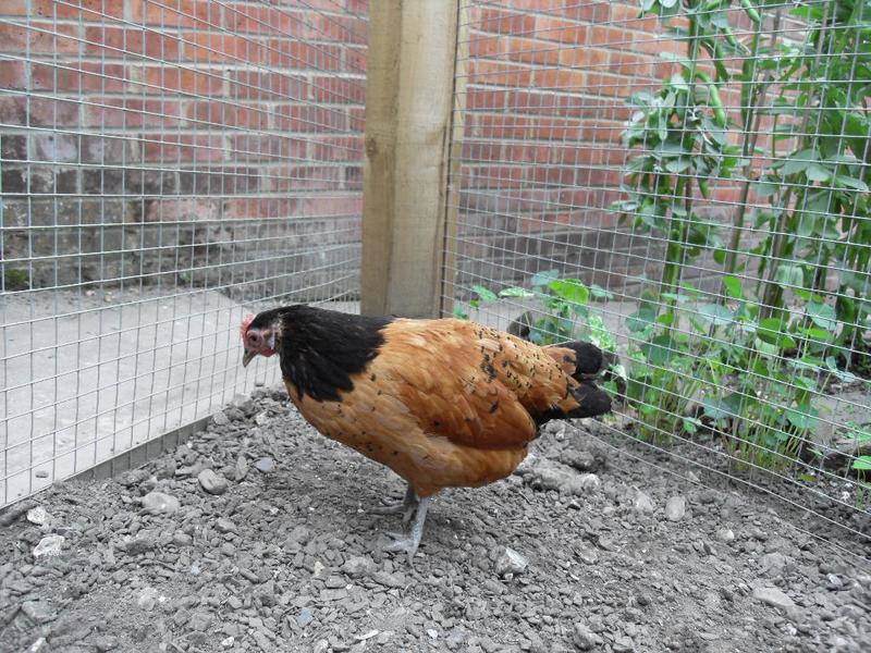 Amber has missing feathers from her neck at the front, giving her a slightly scruffy look. She is also missing the rounded top part of her comb furthest from her beak. The photo isn’t close enough to see this but she doesn’t like the camera too close. The rounded part of her comb got pecked off during the first battles of introducing the new girls. The bantys are vorwerks and Amber is the more feisty of the two.