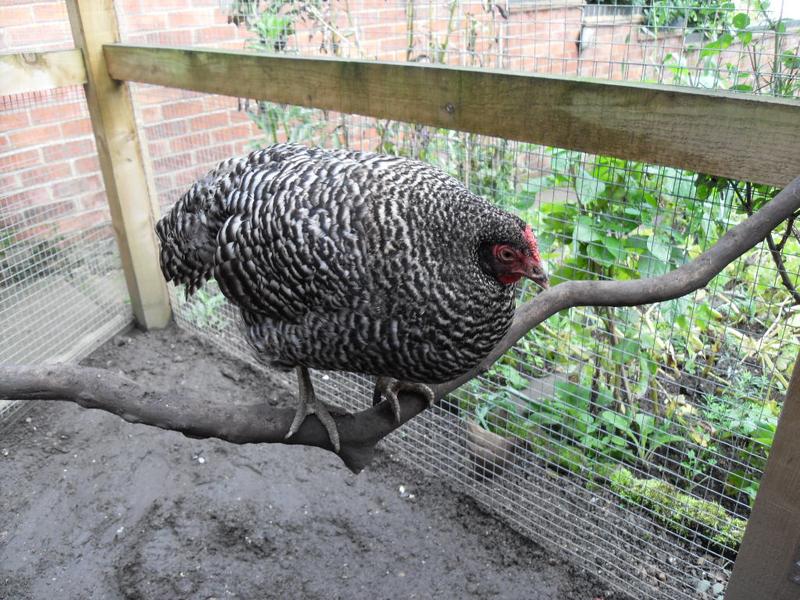 Dotty is fast and slim and can jump from the ground to my shoulder whereas Pepper being heavier will only jump on my back when I am bent over. Peppers favourite spots for sitting are a hollowed dust bath near the bush, the space between the wooden block and the dividing chicken wire or the branch perch.