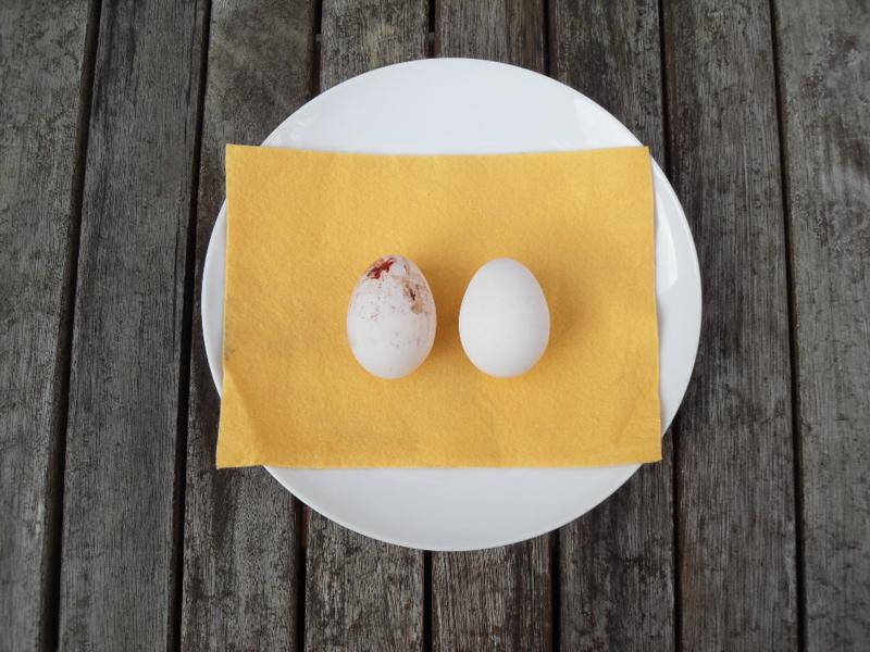 The egg on the left is a medium sized shop bought egg for comparison. Today’s egg is on the right. It is slightly bigger than the second egg and a little less clean for landing outside.